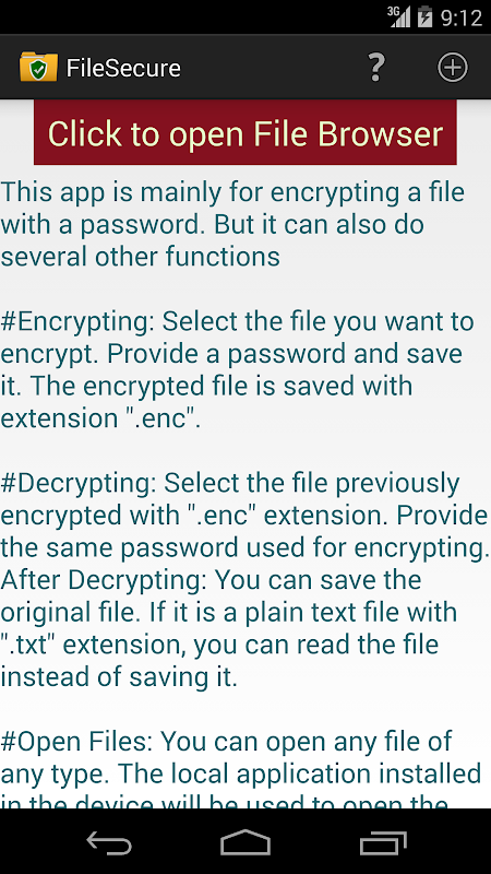 This app is mainly for encrypting a file with a password. But it can also do several other functions