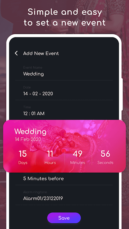 The countdown time also helps you to keep focus on the list of work that you need to finish before the event. Know how much more time is left.