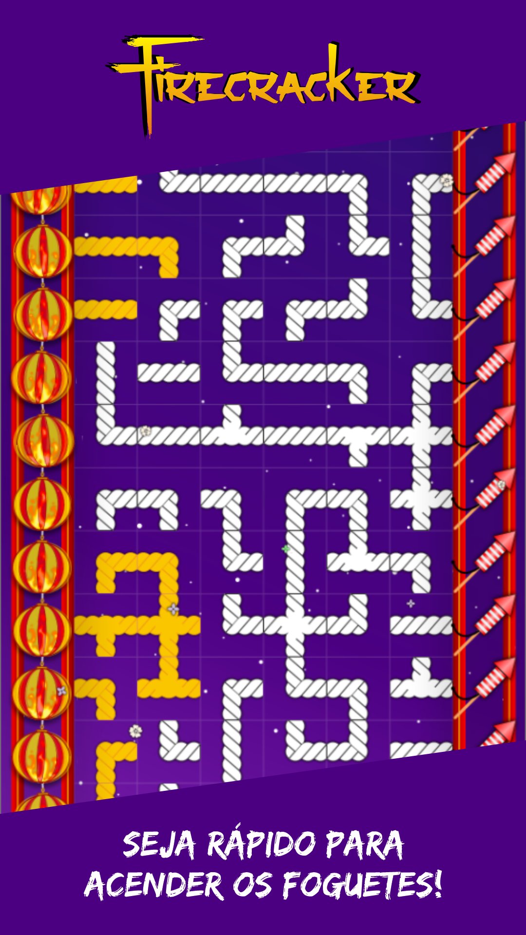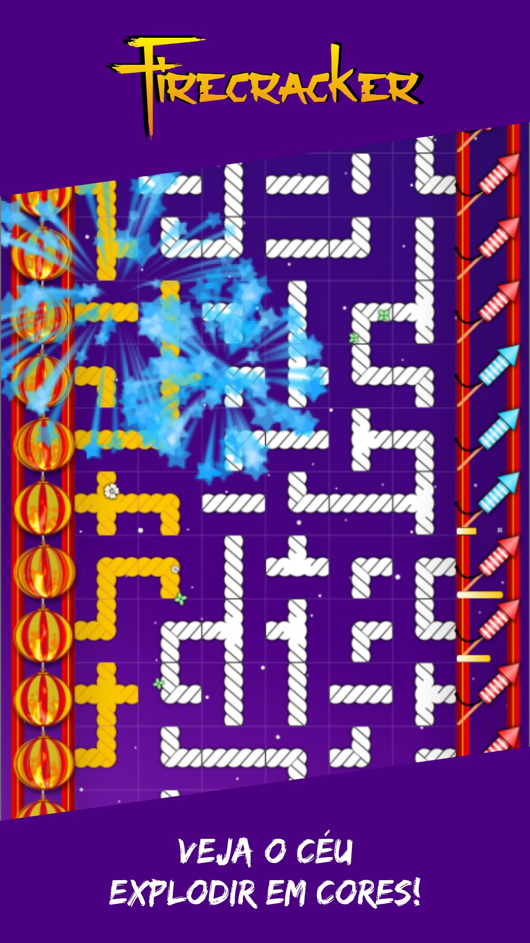 Em Firecracker, sua missão é girar os cordões e conectar as lanternas chinesas aos foguetes, criando uma rede de luz e cor. Cada cordão que você rotaciona é uma chance de acender um novo foguete, mas fique atento: o tempo está correndo! A cada nível, mais fogos precisam ser acesos para criar explosões deslumbrantes no céu. Mas se o tempo acabar o céu perde sua magia. Quanto mais rápido e preciso for o seu movimento, mais incríveis serão as explosões!