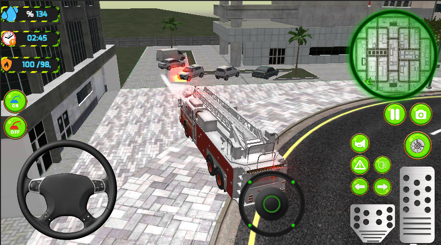 You can reach the disaster area faster by activating the sirens and vehicle lights while driving. Extinguish the fires by squirting water with the help of the joystick.