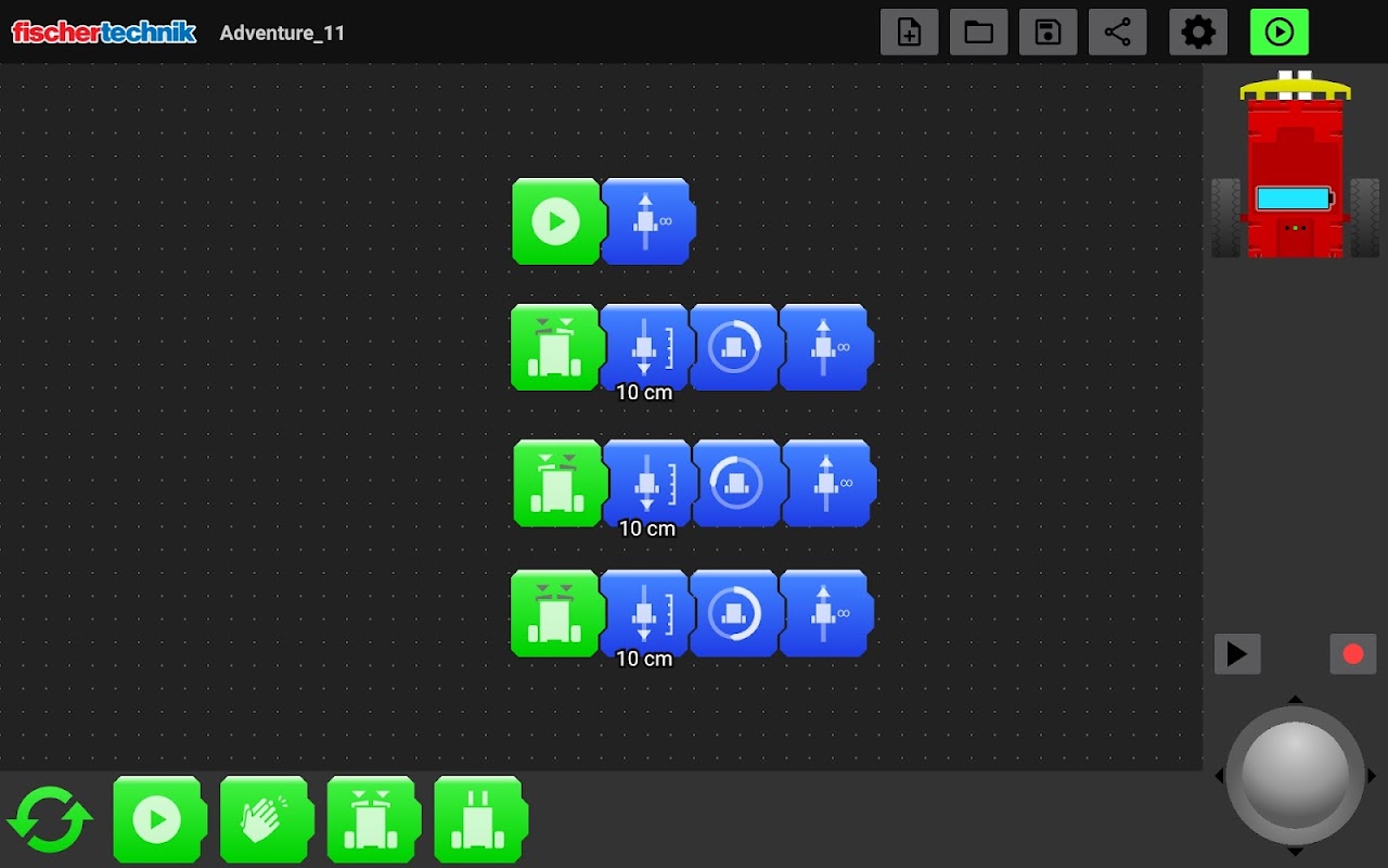 Escrever seu próprio programa e dar vida a um robô é incrivelmente divertido e emocionante! Esta tecnologia tornou-se indispensável no mundo de hoje. Para aproximar este tópico interessante e importante dos mais jovens, nossa codificação inicial da fischertechnik é perfeita. A entrada no mundo da informática e da robótica é bem-sucedida através dos componentes acabados com muita diversão e entusiasmo. Os dois motores e sensores estão totalmente integrados em um bloco. Isso significa: ligue-o, conecte-o ao dispositivo móvel via Bluetooth e comece! O ambiente de programação gráfica simples com os exemplos prontos é apropriado para a idade - perfeito para começar no mundo da robótica! Criar seu primeiro programa também é uma brincadeira de criança com o software.