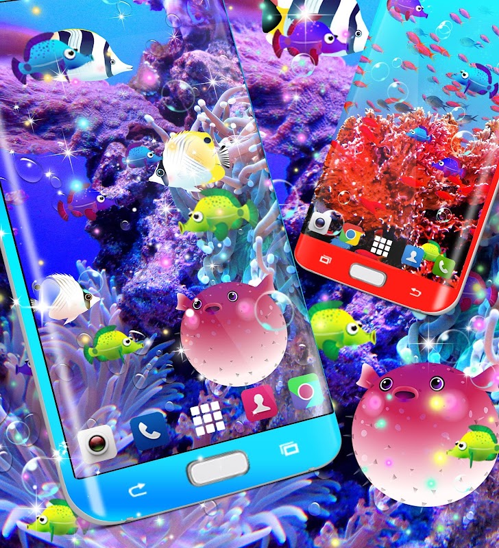 Peixes incríveis no aquário virtual do jardim aquático ou no oceano, os peixes dos desenhos animados nadarão por toda a tela. Você encontrará fundos com peixes-palhaço, peixes-balão e lindos corais, oceano azul e algas marinhas.
