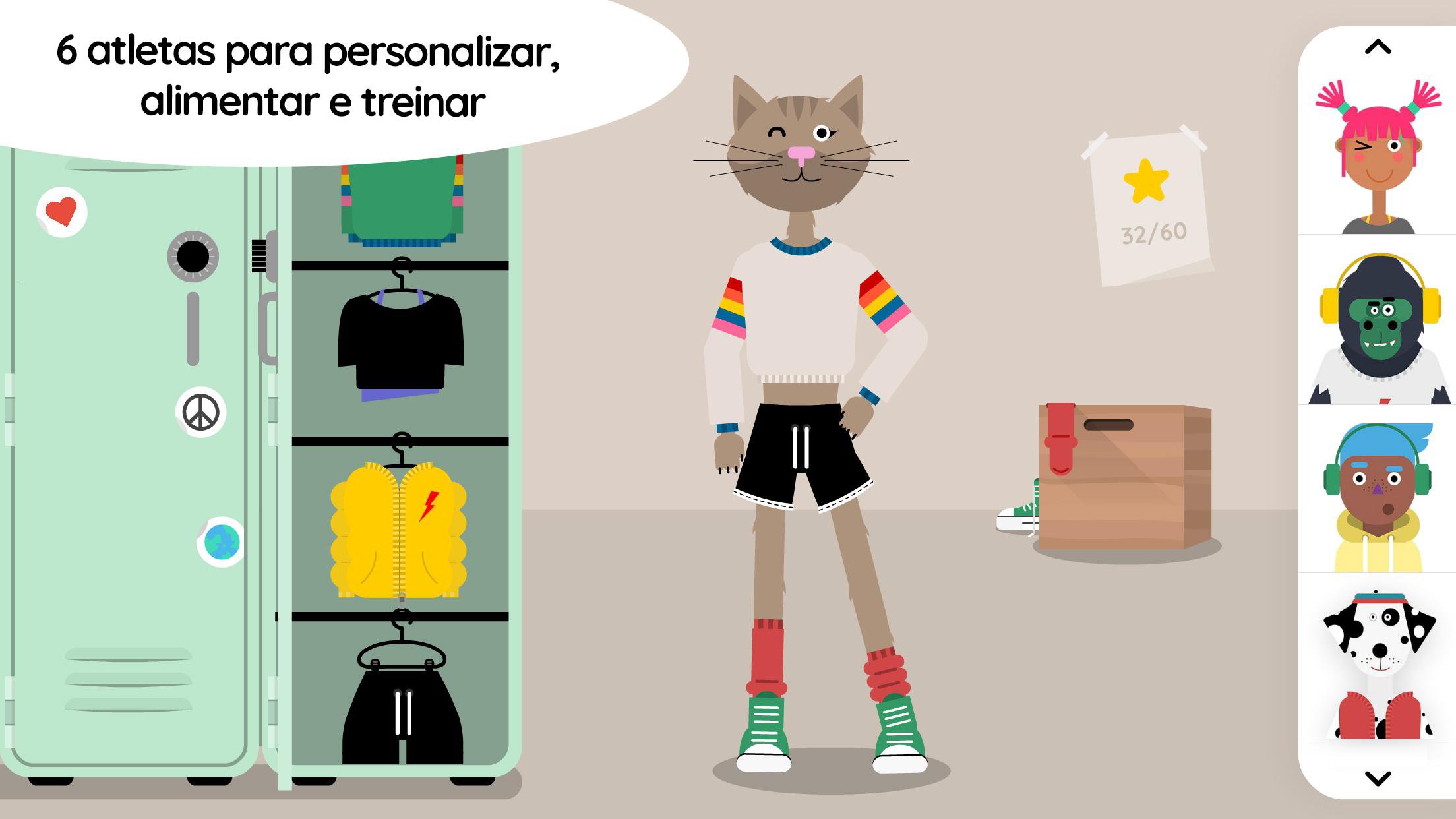 Escolha um de 6 hilários personagens, escolha suas roupas esportivas e comece seus exercícios! Você descobrirá se um gorila é capaz de fazer agachamentos e se um gato conseguiria fazer snowboarding como um profissional.
