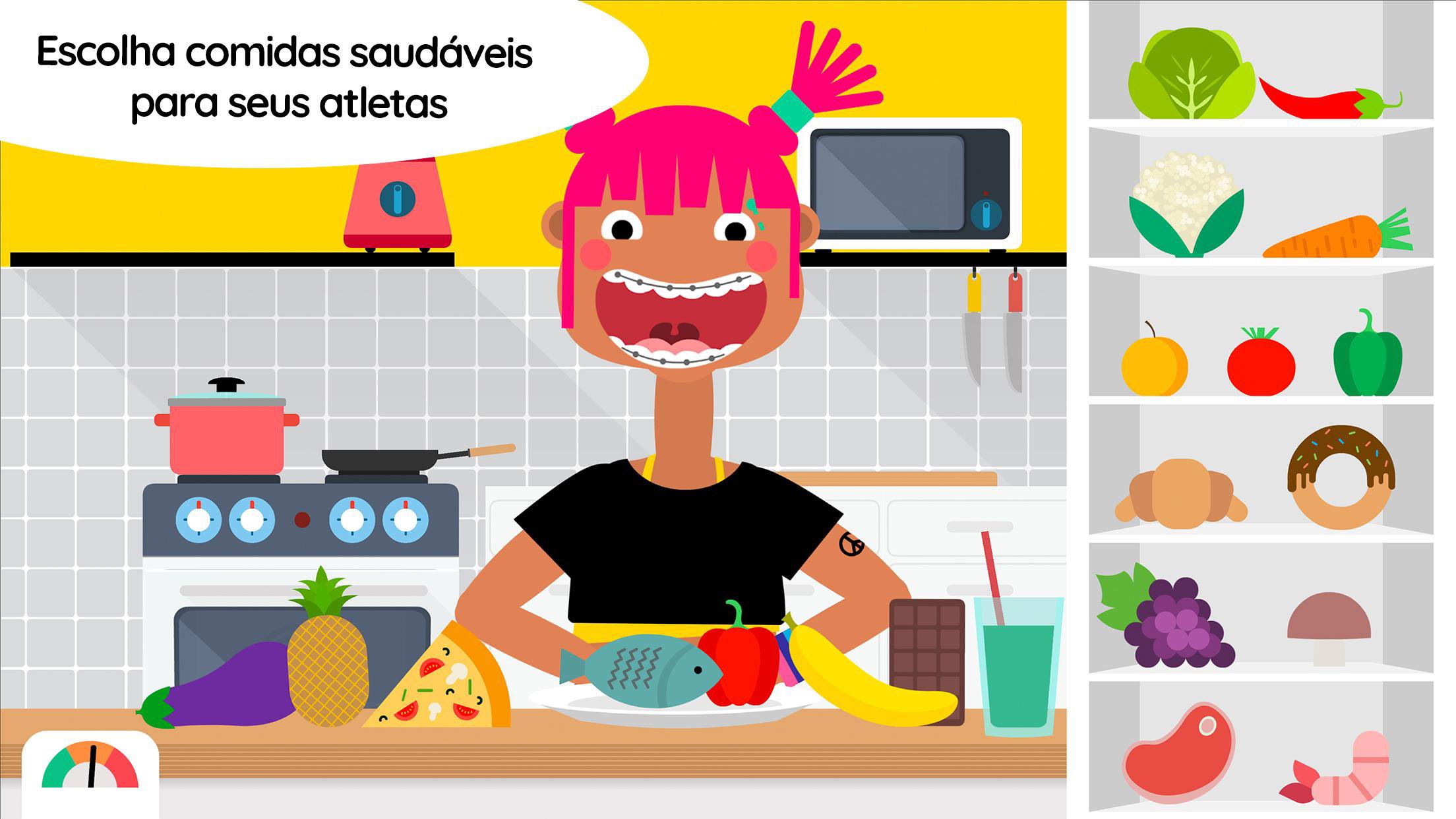 Então está na hora de comer... mas comer o quê? Bem, isso depende de você. Na cozinha, que está sempre abastecida, coloque um pão no liquidificador, frite uma barra de chocolate, coloque uma maçã no micro-ondas... ou prepare algo mais convencional! Há vários tipos de produtos perfeitos para nossos atletas, de frutas e legumes a queijo e bolos... Mmmm. Como será a alimentação dos seus atletas, para garantir sua forma e sua saúde?