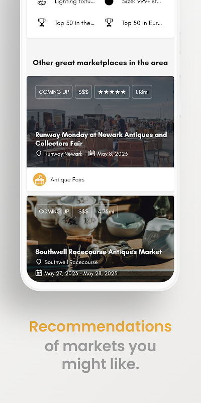 Obtenha a programação detalhada de mais de 500 grandes feiras de antiguidades e mercados de pulgas em todo o mundo com até um ano de antecedência e exporte diretamente para o calendário do seu smartphone. Além disso, os usuários Premium agora podem ver as datas dos próximos eventos diretamente nos cartões de visualização de cada listagem. Uma grande economia de tempo!