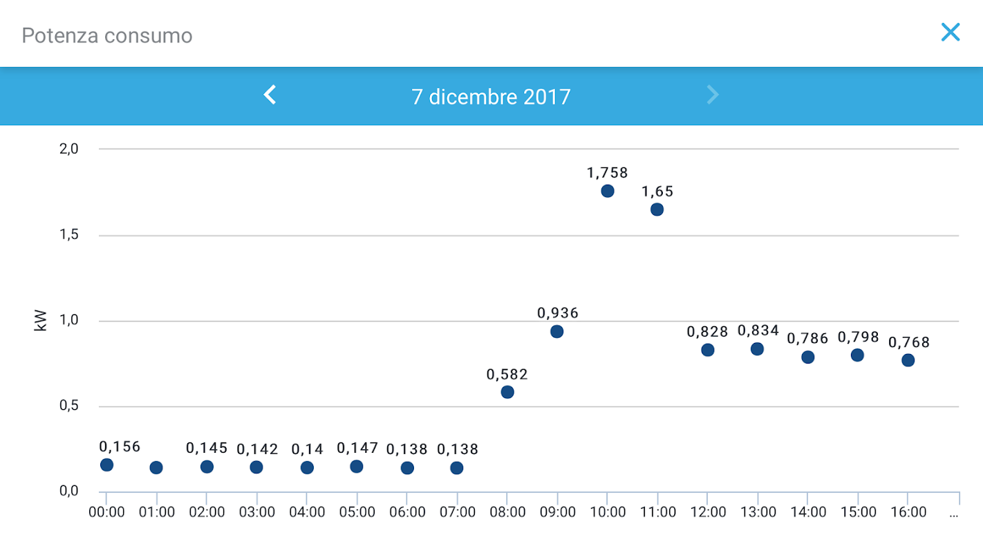 • verificare se i consumi sono in linea con le aspettative attraverso i grafici di consumo giornalieri, settimanali e mensili di energia consumata e potenza prelevata;