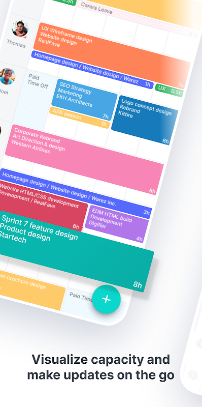 Acesse sua programação de trabalho de qualquer lugar. Planeje recursos, acompanhe projetos e registre o tempo diretamente do seu celular.