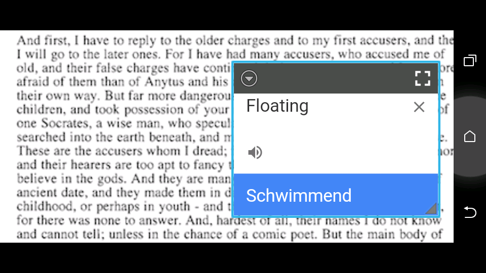 Floating Translator is a translation android app which has been designed for delivering maximum ease of use especially for scanned texts. With this app, you can seamlessly read you text without any interruption and every time you want, translate any part of your text with a nice resizable (pinch zoom, side swiping …) and highly flexible, movable and auto-focusable translate window. This app uses most reputed translators which is selectable by user. We highly recommend this for those who read foreign texts daily and needs an easy to use with complete features of a translator.