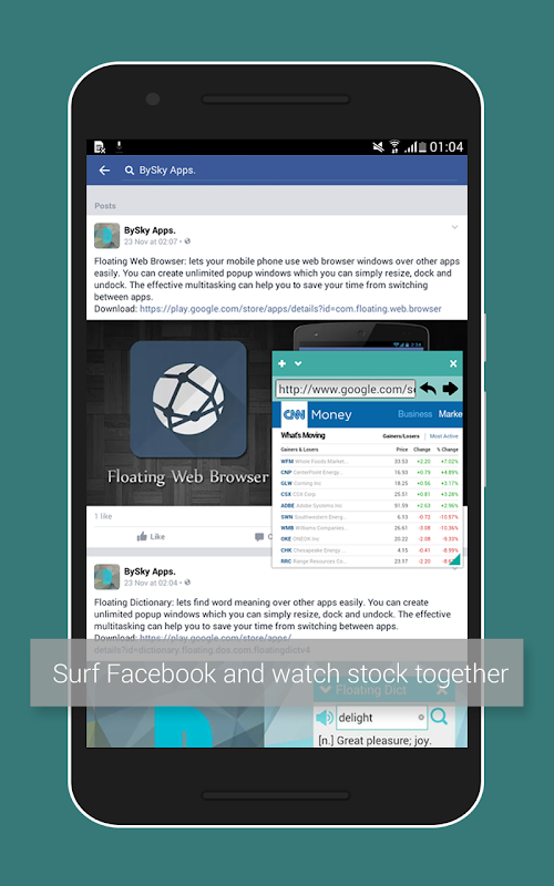 Floating Web Browser: lets your mobile phone use web browser windows over other apps easily. You can create unlimited popup windows which you can simply resize, dock and undock. The effective multitasking can help you to save your time from switching between apps.
