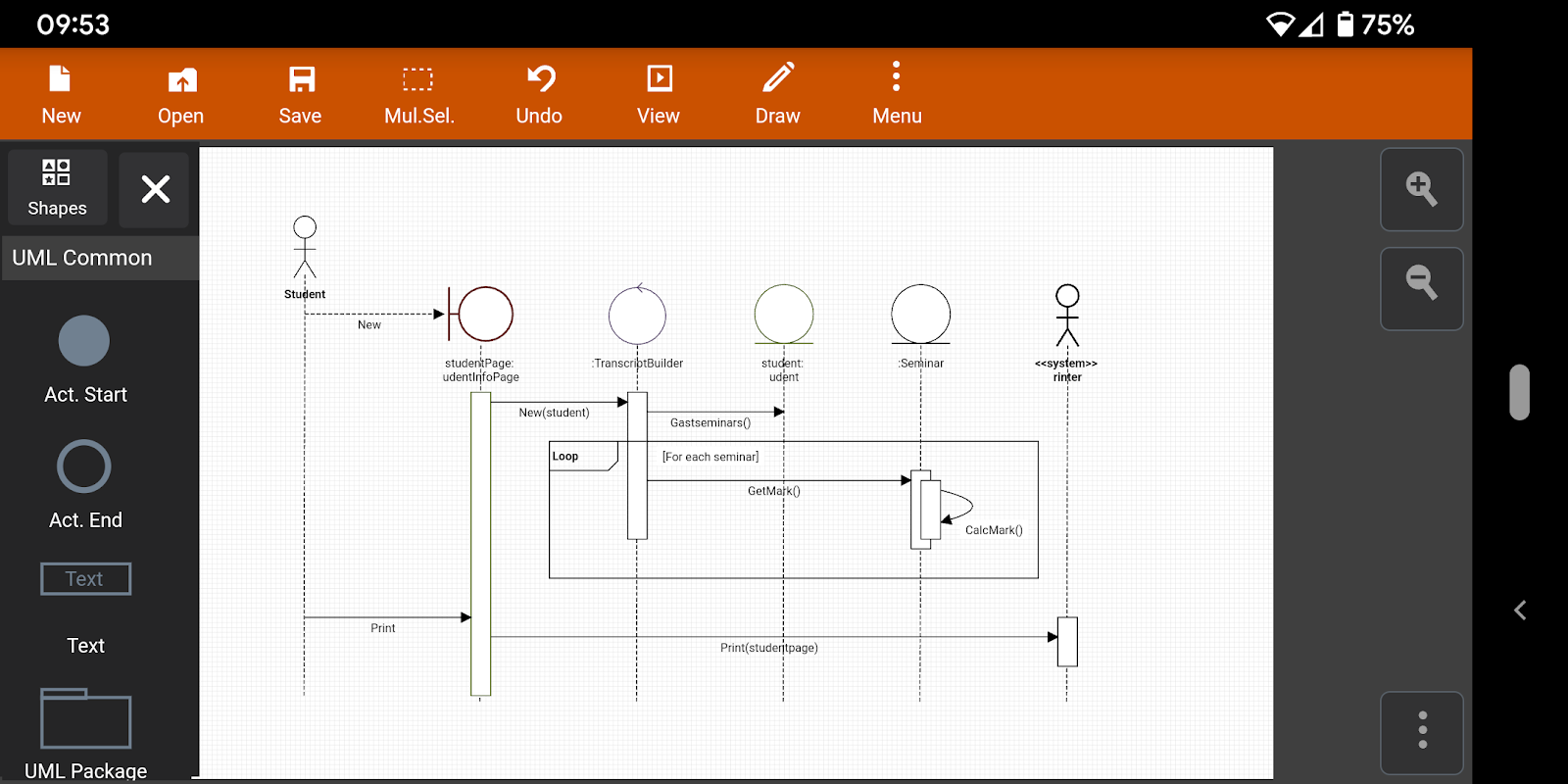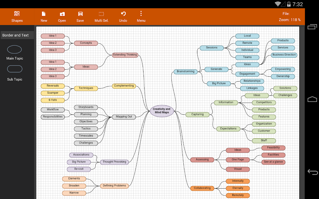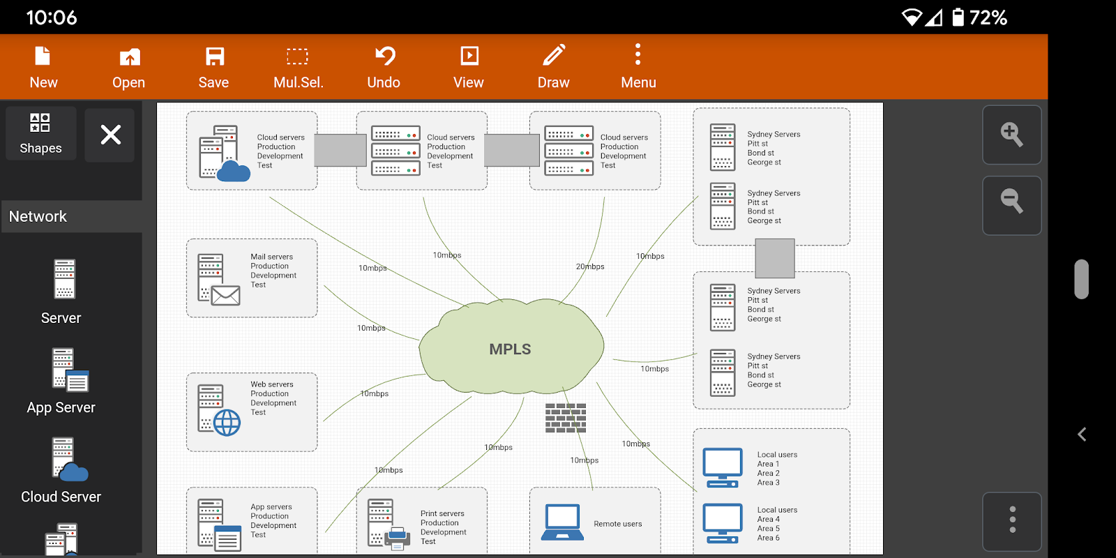 O aplicativo foi projetado com facilidade de uso em mente. Você pode conectar rapidamente formas de fluxograma simplesmente selecionando os pontos de conexão inicial e final e adicionar rapidamente novas raias a um diagrama de raias ou novos subtópicos a um diagrama de mapa mental usando o botão "+" no menu de forma de raia ou mapa mental selecionado. Os subtópicos do mapa mental são posicionados automaticamente na página, mas podem ser movidos facilmente conforme necessário.