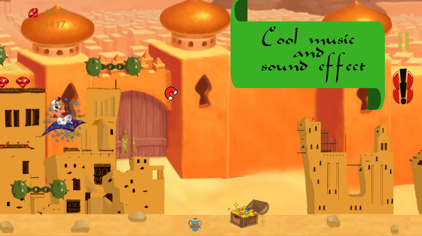 Your wonder carpet can’t protect you from swords & maces, but the genie can. His your protector! Every time you collect a genie token, you can rest assured you’ll be safe from any danger for a period of time. The token will turn into blue sparks that will surround you and the magic carpet and it will keep you safe from any potential threat- now, doesn’t it make you feel like a sheik?!