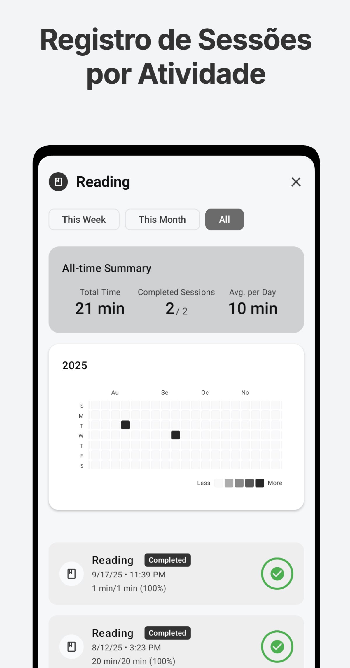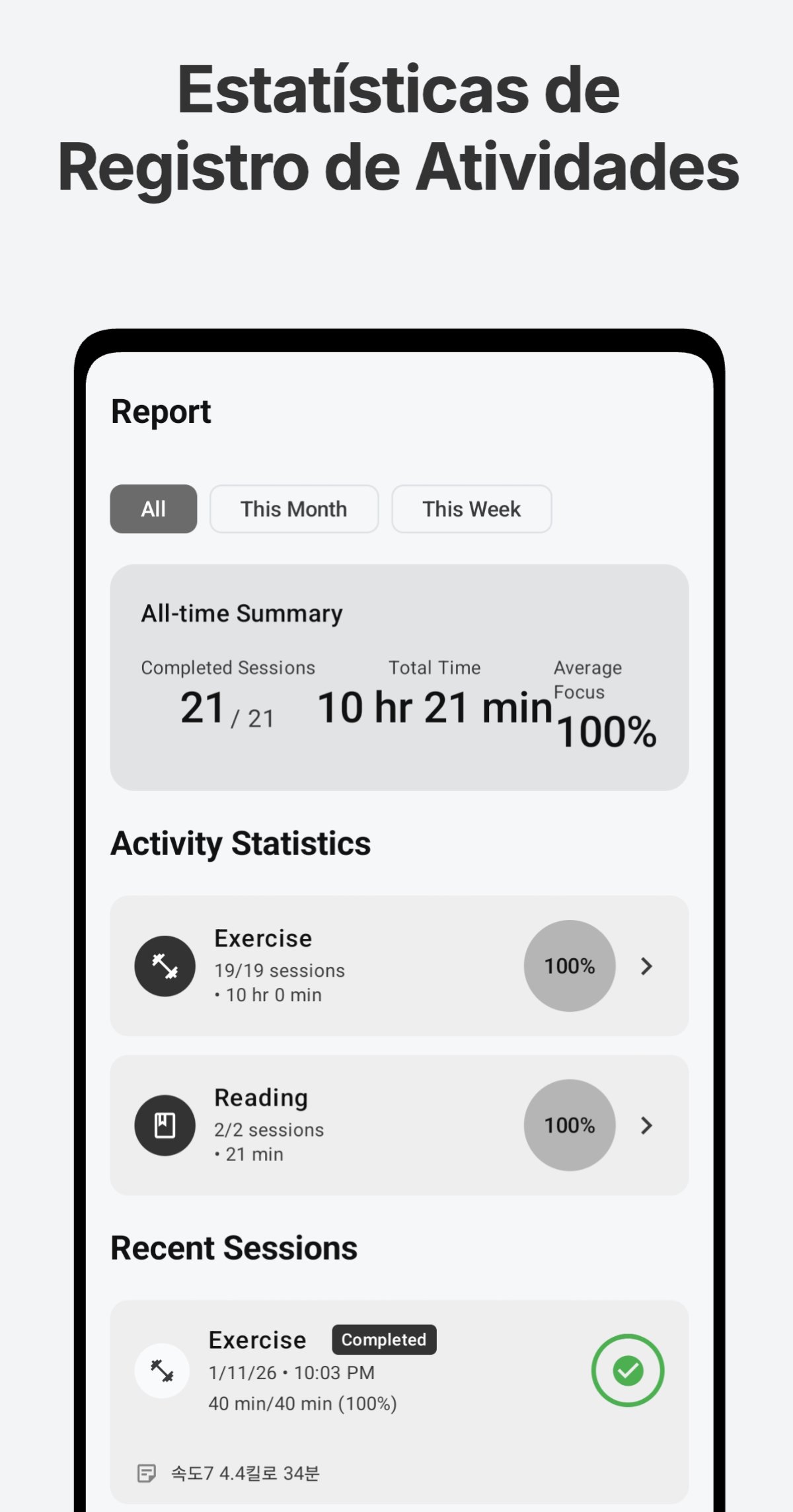 - Estatísticas por Atividade: Veja em um relance em quais atividades você se concentrou e quanto tempo dedicou, com estatísticas detalhadas.