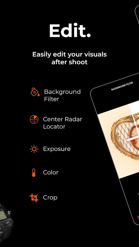 O aplicativo Foldio360 controla a mesa giratória Foldio360 e o Foldio360 Smart Dome para criar visuais de 360 °.