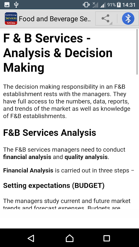 Food and Beverage Services is related to all the activities pertaining to preparing for service and serving food and beverages. This tutorial introduces you to various types of services, table settings, various equipment used in service, types of menus, types of service operations, food garnishes and accompaniments, and various standard operating procedures followed by food and beverage service business.