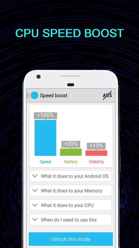 CPU Master have 3 automatic boost modes, i.e. Speed Boost, Battery Boost and Stability. Enable Speed Boost I'd you want Increased speed. Enable Battery Boost if you want to make your phone last longer. And enable Stability mode if you'd like to maintain overall stability of your phone.