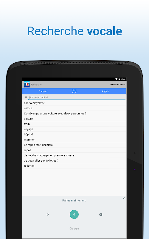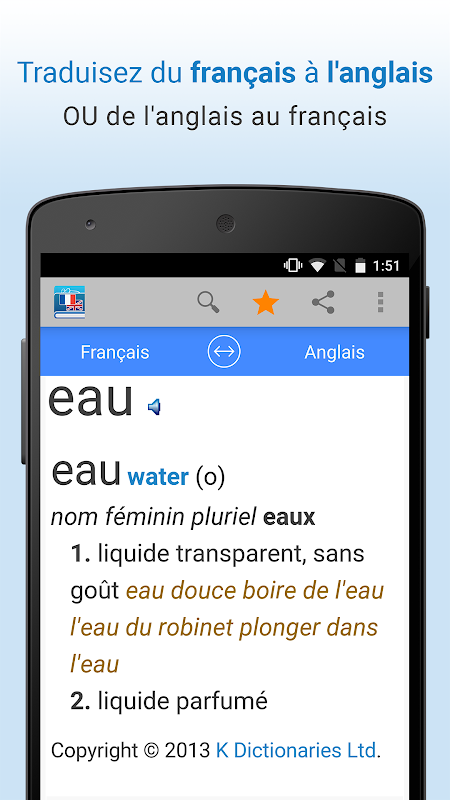 Traduzir palavras e expressões comuns do francês para o Inglês ou Inglês em francês! O bilíngue dicionário Francês-Inglês Farlex fornece instantaneamente traduções com busca por voz ou texto, mais acesso a áudio pronúncias, definições, frases de amostra e muito mais!