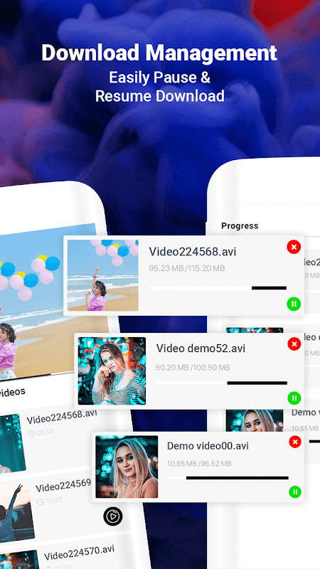 HD video downloader app auto detects videos, you only need to click the download button. Pause, resume, or remove downloads as you like. It also supports multiple downloads and background download.