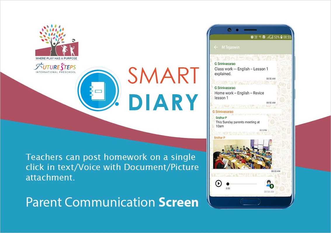 Passos Futuros O aplicativo Preschool Internacional fornece um sistema de comunicação instantânea para funcionários, professores e pais. Ele ajuda os professores a enviar qualquer tipo de informação sobre os alunos aos seus pais instantaneamente com apenas um clique.