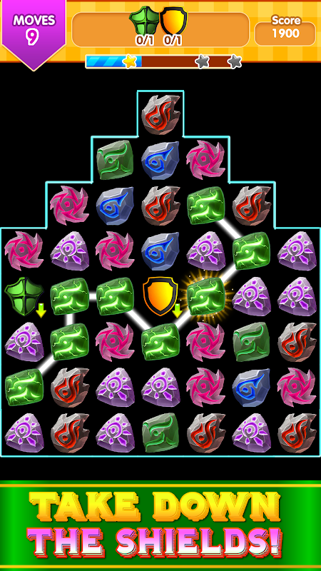 Link 3 or more gems to make them sparkling to get scores, collect gems, clean blocks, take down the shields...
