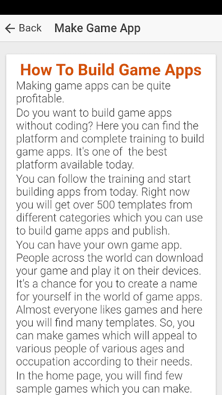 Você terá acesso a uma plataforma muito confiável para construir aplicativos e poderá construir e publicar vários tipos de aplicativos de jogos. Também é fornecido treinamento completo para que você possa fazer seu próprio aplicativo de jogo.