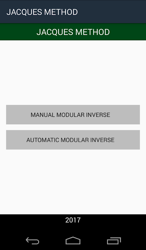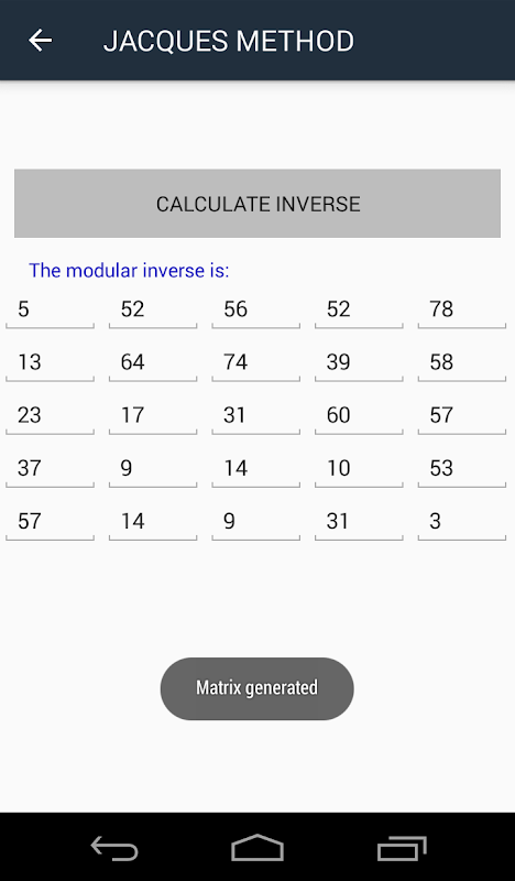 The user can input the modulo and the size of the matrix for any of the two options. In the first option, the user input manually all the values of the n x n matrix according to the size, and in the second option, the application generates automatically a modular invertible matrix according to the size and the modulo.