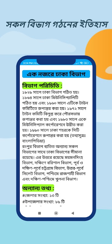 Em primeiro lugar, com a ajuda deste aplicativo, você pode conhecer a história da formação de todas as oito divisões de Bangladesh. Além disso, você obterá informações sobre pontos turísticos de 64 distritos de Bangladesh, o que facilitará sua experiência de viagem. Você também receberá mapas de oito departamentos, incluindo serviços de emergência e muitas informações que irão multiplicar seu conhecimento.