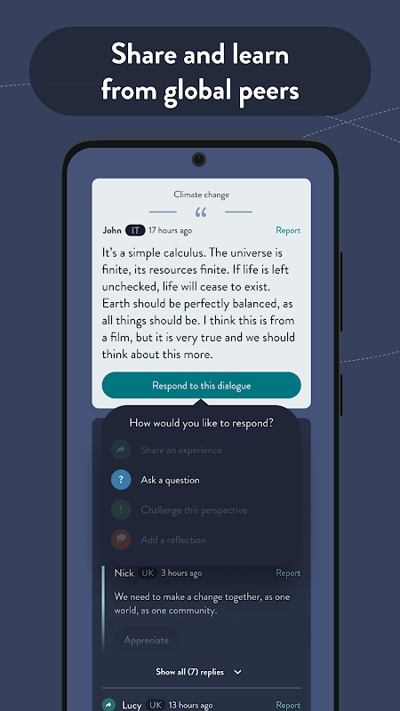 À medida que você explora diversos tópicos globais, como Mudança Climática, Mídia Social e Fake News, Discurso de Ódio Online, Identidade e Pertencimento, Direitos de Meninas e Mulheres e muito mais, você poderá compartilhar suas perspectivas e aprender com milhares de pares internacionais em Videoconferências e Espaços de Diálogo ao vivo. Prepare-se para ampliar seus horizontes e obter novos insights sobre o mundo ao seu redor.