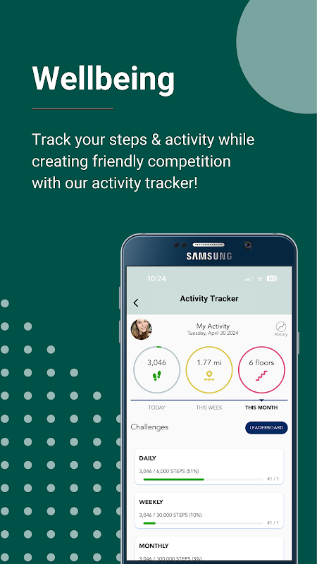 Monitore seus passos, compita em desafios com colegas e priorize seu bem-estar com o Monitor de Atividades! Ao sincronizar o Google Fit ou o Health Connect já existentes no seu dispositivo, você pode ver suas atividades diárias, semanais e mensais diretamente no aplicativo. Após a conclusão da sincronização inicial, você pode começar a monitorar suas atividades e trabalhar para atingir suas metas de condicionamento físico! Caso você não veja o Rastreador de Atividades ativo no seu aplicativo, entre em contato com sua equipe de RH para habilitar o recurso para você.
