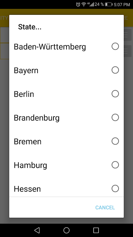 Berlim, Bayern (Baviera), Niedersachsen (Baixa Saxónia), Bade-Vurtemberga, Renânia-Palatinado (Renânia-Palatinado), Saxónia (Sachsen), Turíngia (Turíngia), Hessen, Nordrhein-Westfalen (Renânia do Norte-Vestefália), Saxónia- Anhalt (Saxony-Anhalt), Brandemburgo, Mecklenburg-Vorpommern, Hamburgo, Schleswig-Holstein, Sarre, Bremen.