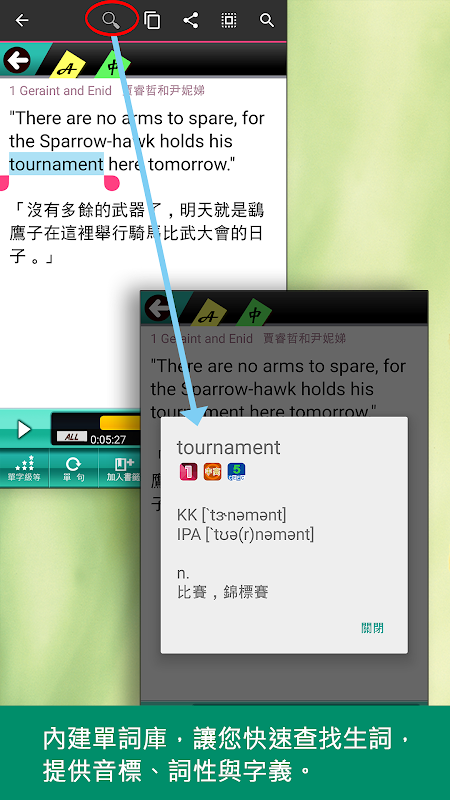 5. 查字義功能,內建單詞資料庫,針對查詢的單詞提供音標、詞性、字義,協助快速理解文章內容。