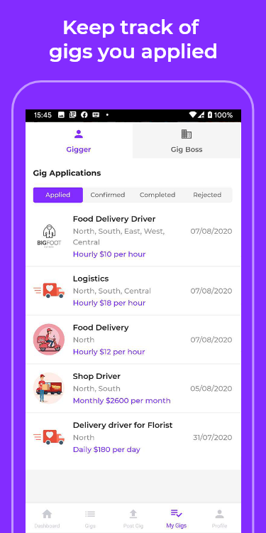 - Giggers podem visualizar facilmente todos os seus aplicativos e seus status.