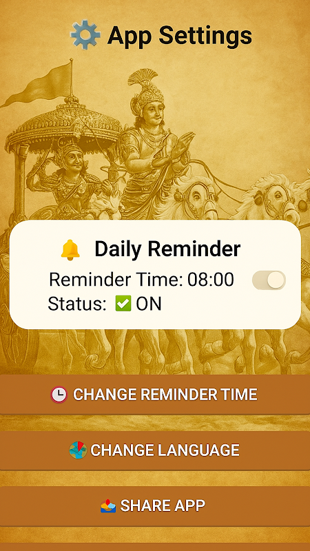 Este aplicativo oferece um shlok do Bhagavad Gita todos os dias em seu idioma – hindi, bengali ou inglês. O verso vem com um significado simples e é lido em voz alta assim que você abre o aplicativo. Não precisa clicar em nada, ele toca apenas uma vez por dia.