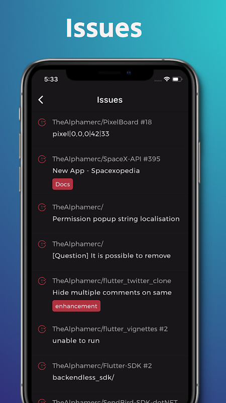 • Visualize o perfil do usuário, gráfico de contribuição, atividades, repositórios, pullrequest e problemas