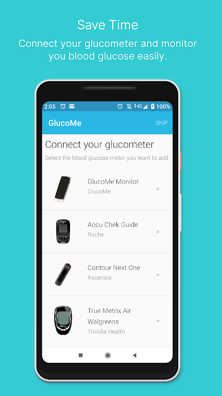 Conecta-se ao monitor de glicose no sangue GlucoMe, bem como ao Accu Chek Guide, Contour Next One, Walgreens True Metrix Air, monitores de glicose no sangue True Metrix Air Bluetooth da CVS Health e muito mais.