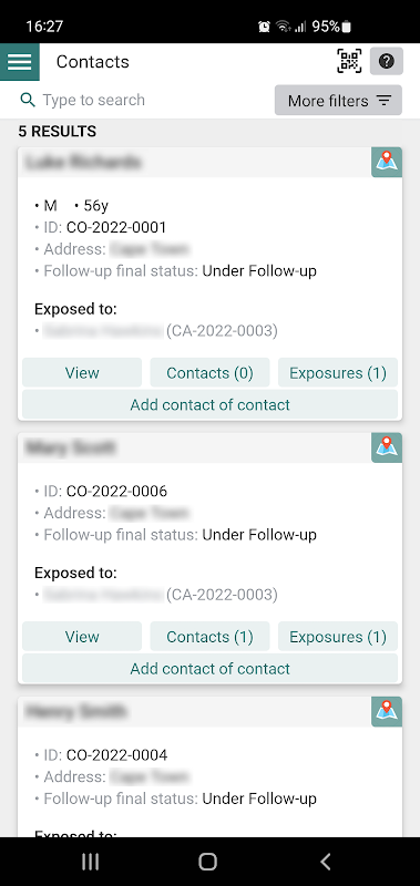 O usuário pode adicionar casos, contatos, contatos de contatos e resultados de laboratório. Além disso, os usuários também têm a opção de criar eventos que podem ser relevantes para a investigação do surto. As listas de acompanhamento de contato são geradas usando parâmetros de surto (ou seja, número de dias para acompanhamento de contatos, quantas vezes por dia os contatos devem ser acompanhados, intervalo de acompanhamento).