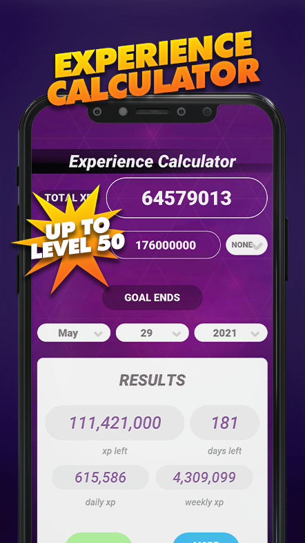 - Calculadora de Experiência: Adicione o número da sua experiência de objetivo e prazo; calcularemos quanta experiência você precisará ganhar diariamente para completar sua meta.