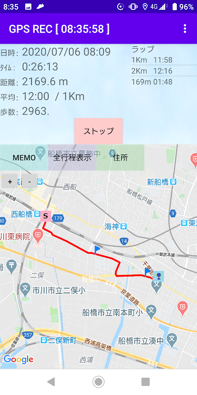 このアプリはスマホのGPS機能を利用して走行ルートや距離・走行時間を記録するものです。