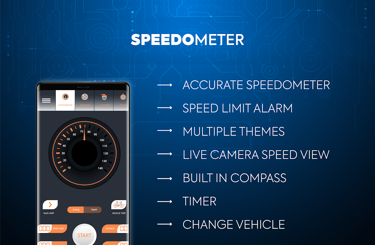 GPs speedometer Car Speedometer & Odometer is a digital speed tracker app that lets you navigate through a speed meter, you can find any vehicle’s traveled speed driving history. GPS speedometer and odometer app is a new speed meter app to find your, bike, car, or train speeds. Speed meter tracks your speed while driving and speed tracker bike speed meter also measures the distance covered by the vehicle. Live speed camera speedometer has a live feature that requires your camera permission to perform tasks with the speed odometer app. The live speedometer app can measure current speed with maximum speed or minimum speed limit. Speedometer checks your multi-speed view and creates KM counter-history for you. This speedometer distance calculator is a helpful app for running or walking people to calculate their distance and running speed history.
