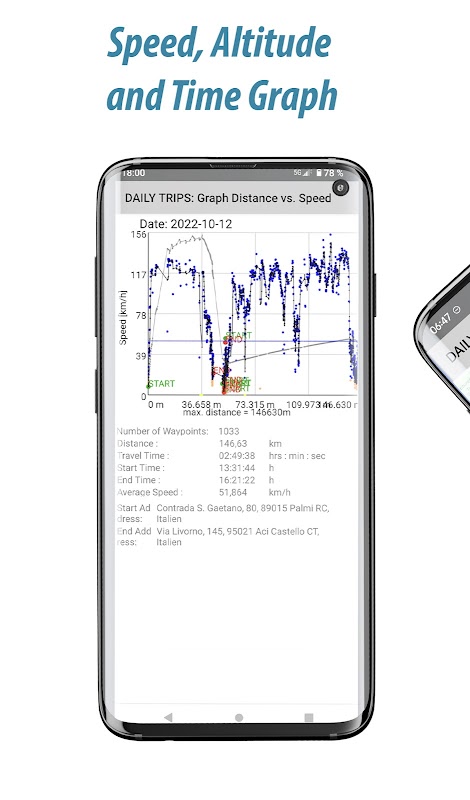 • Visualize suas viagens com representações gráficas de sua velocidade e altitude em relação ao tempo.