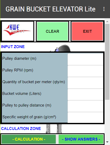 Aplicação para calcular o elevador de caçamba de grãos (transportador de caçamba)