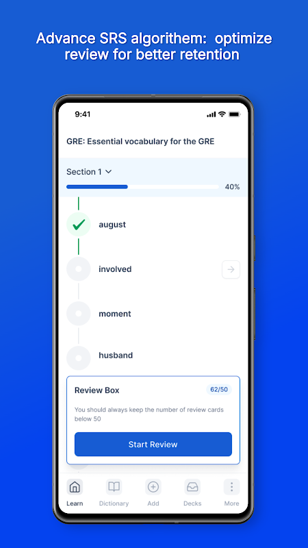 O sistema adaptativo de repetição espaçada garante que você revise as palavras nos momentos ideais, ajudando a memorizar o vocabulário do GRE de forma mais rápida e eficiente.