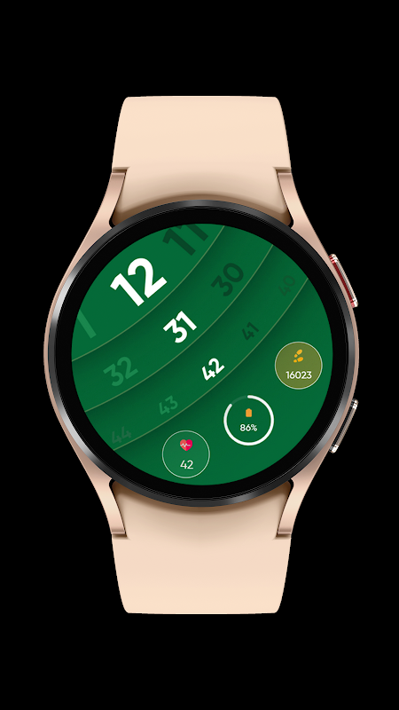 Este mostrador Wear OS cativa com seu design circular minimalista, contra uma tela verde profundo, incorporando uma fusão de simplicidade e estilo contemporâneo.