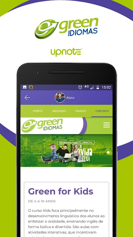 O aplicativo do Green Idiomas reúne todas as informações para manter professores, alunos e responsáveis informados sobre o calendário, eventos e demais notificações da escola.