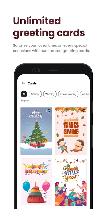 Greetify é uma nova maneira de expressar seus pensamentos e sentimentos. Expressar sentimentos leva apenas alguns momentos, mas as impressões são para sempre. A coleção de cartões comemorativos de qualidade escolhidos a dedo da Greetify ajuda você a enviar seus pensamentos e sentimentos para qualquer ocasião. Seja um "pensando em você" ou um "casamento", nós temos o que você precisa. Rápido e fácil de criar convites e cartões incríveis em qualquer lugar no seu telefone ou tablet. Greetify é uma maneira ideal de desejar a alguém um feliz aniversário, parabéns, boas festas, desejos de recém-nascido ou qualquer outra ocasião especial.