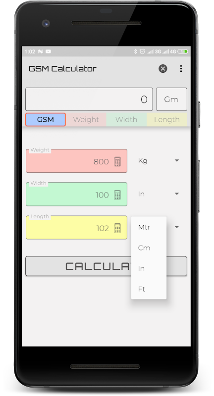 Calcule GSM, peso, comprimento ou largura com este aplicativo simples de usar.