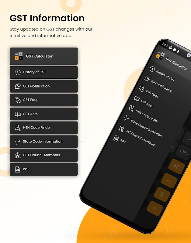 Este aplicativo gratuito de calculadora GST fornece 5 configurações de laje que você pode alterar nas configurações do aplicativo. O aplicativo também possui a funcionalidade de reproduzir um som e vibrar o telefone ao pressionar uma tecla, que pode ser configurada nas configurações.