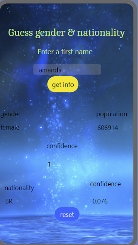 Este aplicativo usa 2 APIs para prever o gênero e a nacionalidade com base no nome. Para rastrear quantas pessoas usam nome e gênero no mundo.