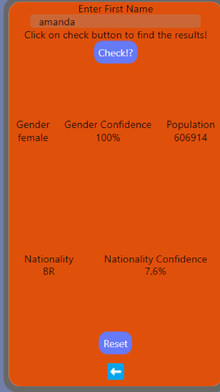Você basicamente terá que inserir um nome e ele informará sua população, confiança, nacionalidade e gênero, portanto, basicamente ajudará você a saber o gênero. Digite um nome e ele informará sua população, confiança, nacionalidade e sexo.