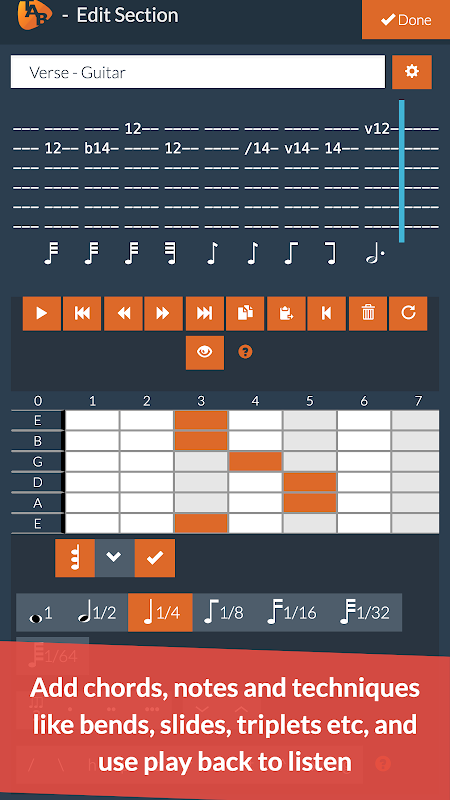 - Adicione técnicas como slides, martelos, notas silenciadas, harmônicas, tremolo, vibrato, fantasmas / gravatas, batidas e muito mais
