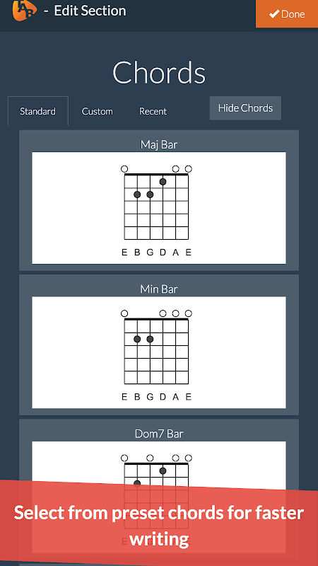 - Escolha entre padrões de acordes comuns para economizar tempo